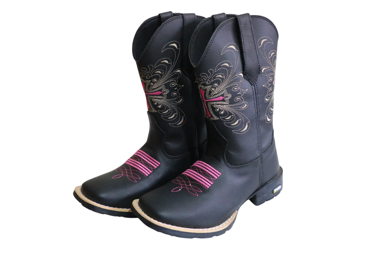 Bota Texana Feminina Cruz Rosa Country Bico Quadrado, feita em courino, solado emburrachado.