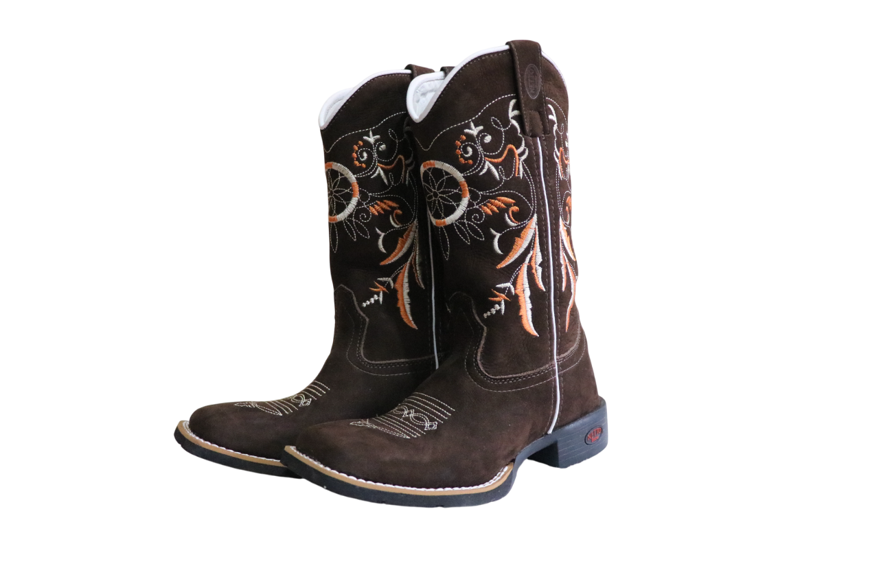 Fabricado em couro na parte do pé,cano de camurça, solado de borracha. detalhes bordados. Cor: Marrom.